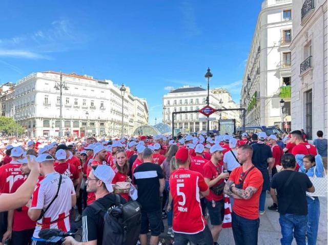自当地时间中午起,马德里的地标建筑太阳门广场上就聚集了数千名柏林联盟远征球迷,他们前赴后继涌向新伯纳乌球场,集体高举手臂放声歌唱。一位柏林联盟死忠接受笔者采访时表示,柏林联盟这支平民球队不似皇马、拜仁这般巨星云集,但他们作为人民的球队,足以与最强大的力量抗衡。